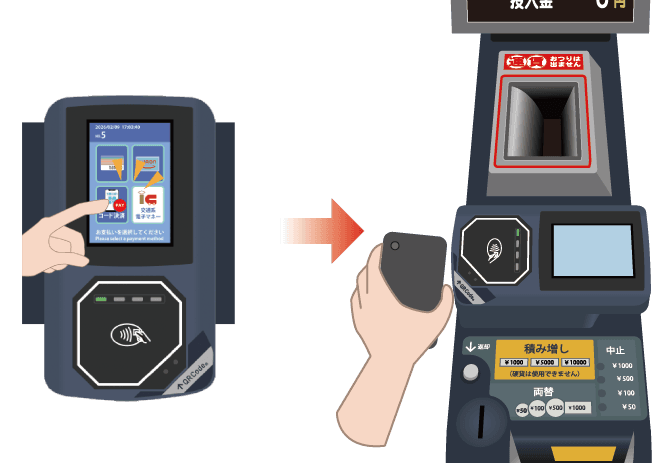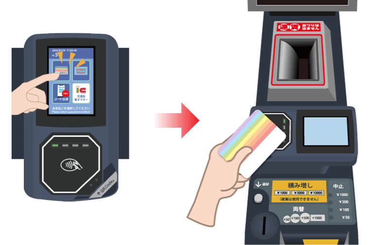 新たに積み増しいただいたあと、再びカードリーダーにタッチしてください。(バス車内でもカードへの積増は可能です)